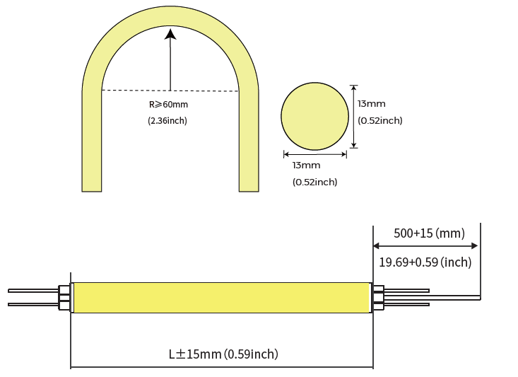 - Dimensions & min. bending radius (24V) 5000 x D13mm | (48V) 10000 x D13mm - R>60mm