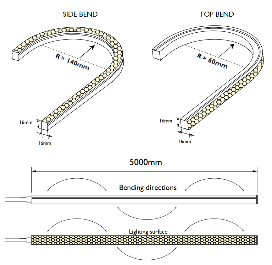 - Dimensions & min. bending radius: 5000 x 16 x 16 mm & R > 60 mm for Top Bend and R >140 mm for Side Bend